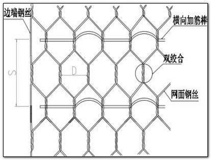 注:鋼絲的抗拉強(qiáng)度應(yīng)在350~550N/m㎡,編織前鋼絲延伸率不能低于8%,鋼絲直徑公差均指未拉伸前,橫向加筋棒應(yīng)編入雙絞合鋼絲之中,不能采用焊接固定或者鋼絲進(jìn)行綁扎固定,嚴(yán)禁采用電鍍鋅鍍層鋼絲。
