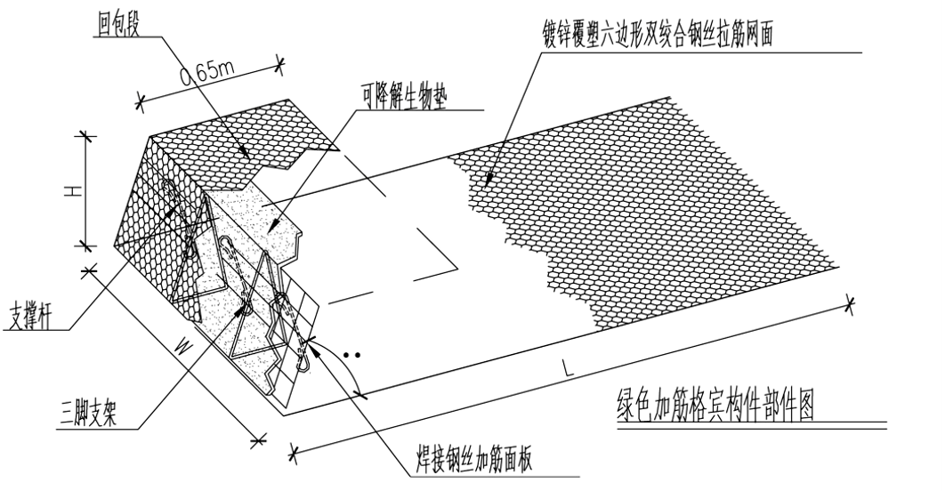 綠色加筋格賓體系由機(jī)器編織的六邊形雙絞合鋼絲網(wǎng)面、焊接金屬網(wǎng)、金屬三角支架、金屬支撐桿、可降解生物墊組合而成,采用傾角為70°的綠色加筋格賓,面墻坡比1:0.364墻體采用級(jí)配碎石土進(jìn)行回填,擋墻底部落于符合要求的持力層上,持力層不符合要求時(shí)采用碎石換填。綠色加筋格賓技術(shù)參數(shù)以圖紙為準(zhǔn),其型號(hào)一般都是3×2×0.76m/6×2×0.76m 另分為GTM與GTMT兩種數(shù)據(jù)!